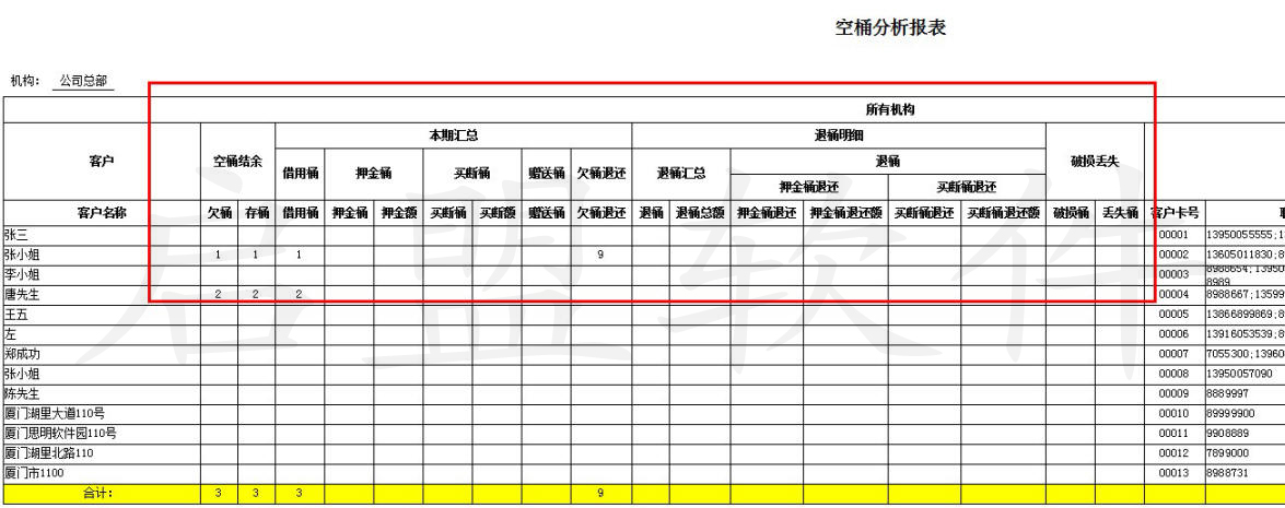 4. 系统中可自动统计分析客户的押桶、押金额、欠桶、买断、破损、丢失等各类桶的详细数据