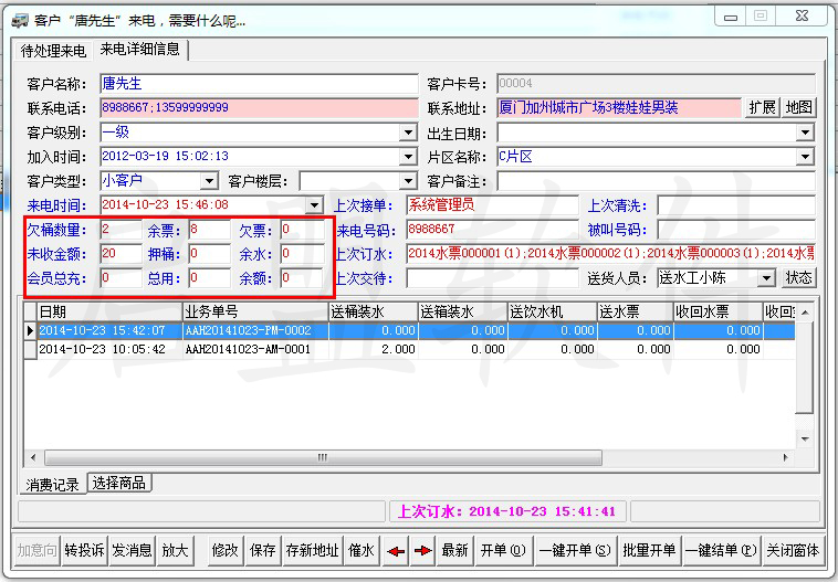 来电显示各项空桶、水票等情况,方便座席人员跟进